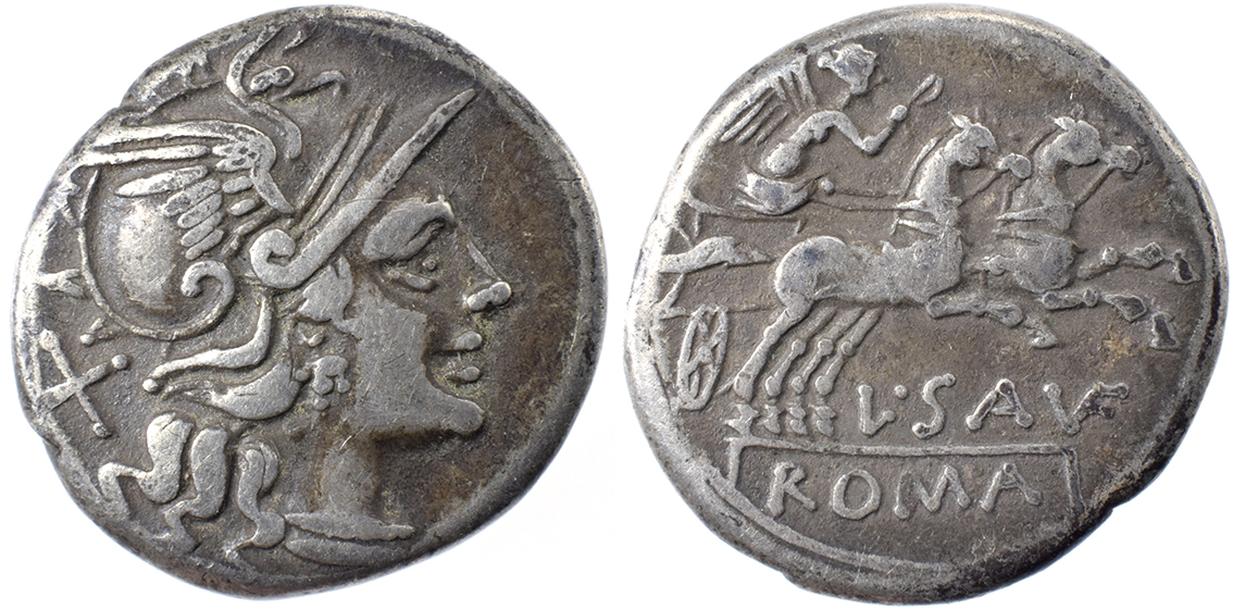 Rom Rep., L. Saufeius, Denar 152 f.K. Victoria i biga