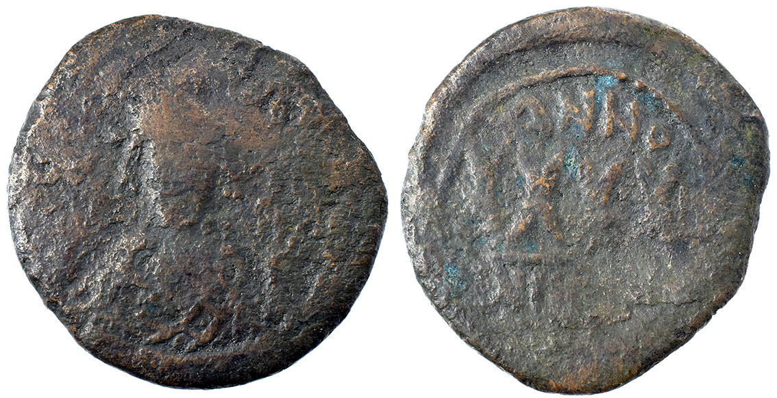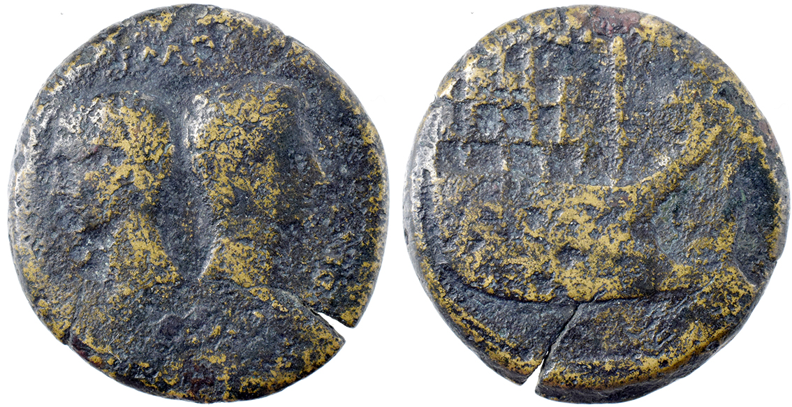 Rom (Wien/Lyon?), Augustus med Caesar, Sesterts (Dupondus?) 27 f.K.-14 e.K. Gallej med sejl. 17,8g.