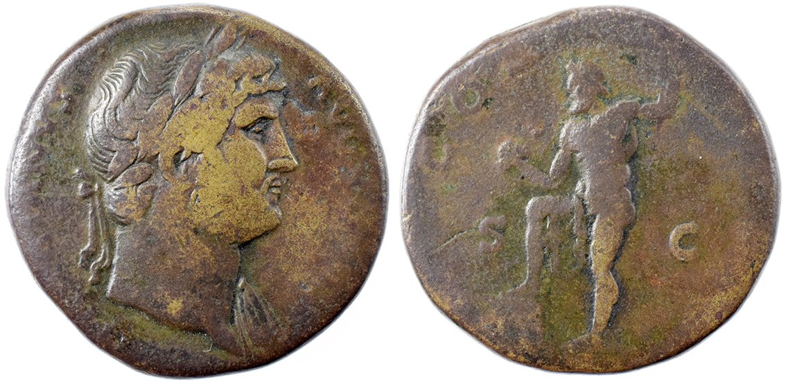 Rom, Hadrian, Sesterts 117-138. Neptun stående. Partiel svag tekst.