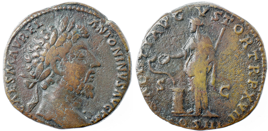 Rom, Marcus Aurelius. Sesterts. 161-180. Salus med slange.