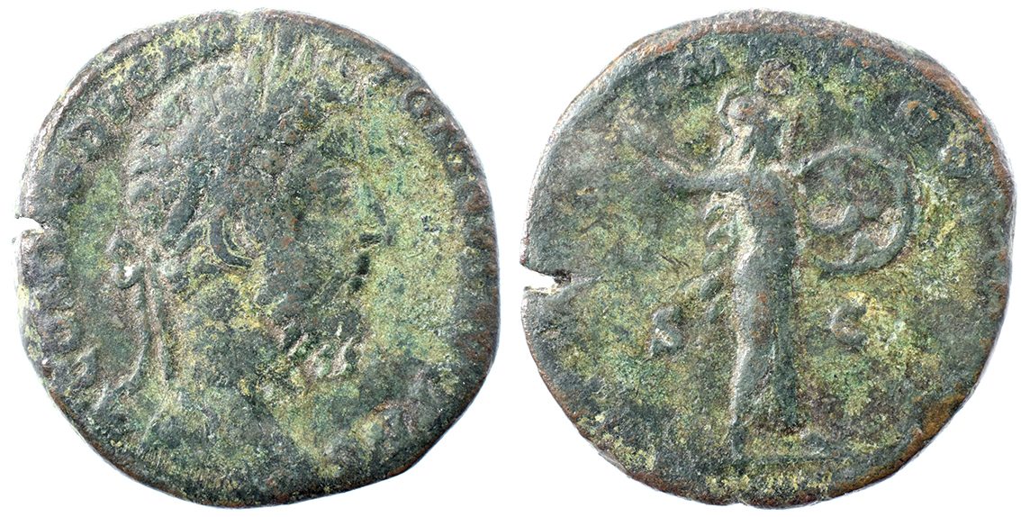 Rom, Commodus, Sesterts. 177-192. Minerva mod højre med spyd og skjold. Mørk patina.