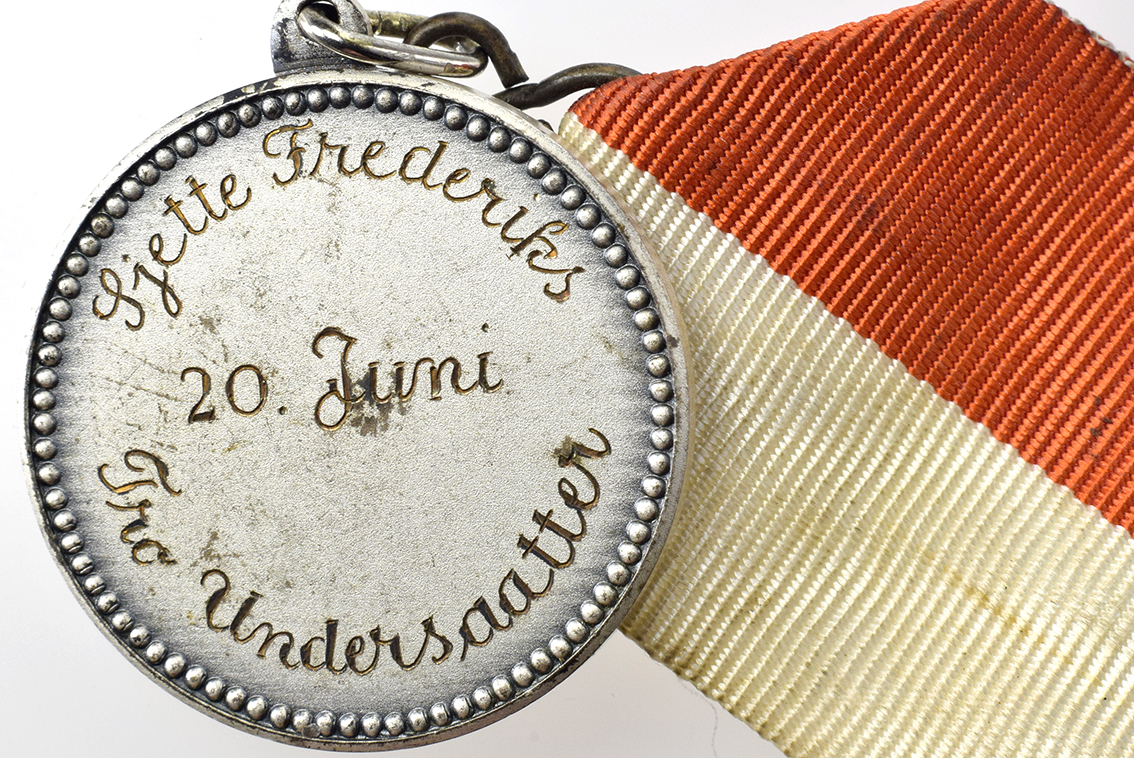 Danmark, av: Sjette Frederiks 20. juni - Fra Undersaatter, Rv. Fra Vuggen var hans Puder haarde graveret 30 mm